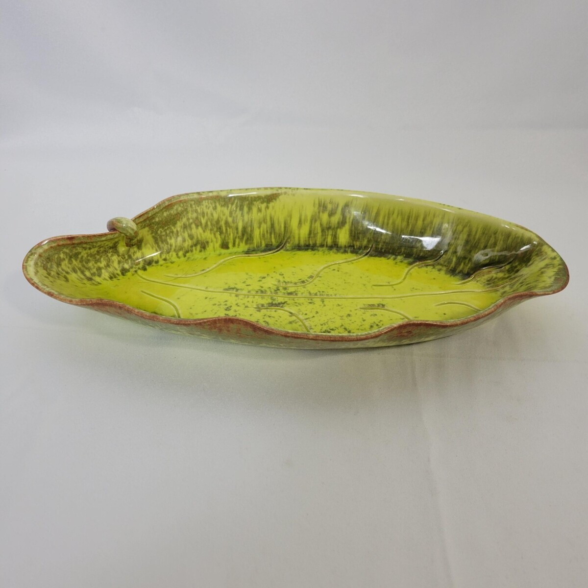 Studio Pottery Glazed Leaf Shape Dish Green Vintage 12 x 5.75 Artist Signed 1994