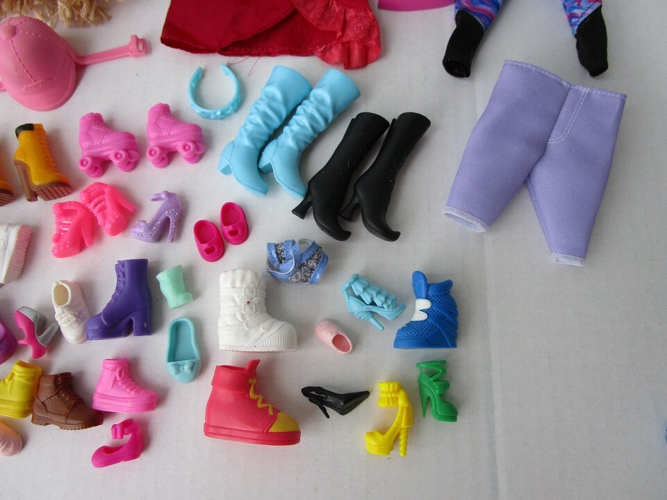 This Fashion Doll Accessory Clothing Lot includes a variety of items such as boots, skirts, dresses, and more designed for Barbie and other dolls, a popular fashion doll for girls. The set includes pieces like a helmet, purse, undergarment, pants, headband, shoes and boots, allowing for imaginative play and styling options. This collection is perfect for young fashion enthusiasts looking to outfit their Barbie doll in trendy and unique attire. Mixed brands