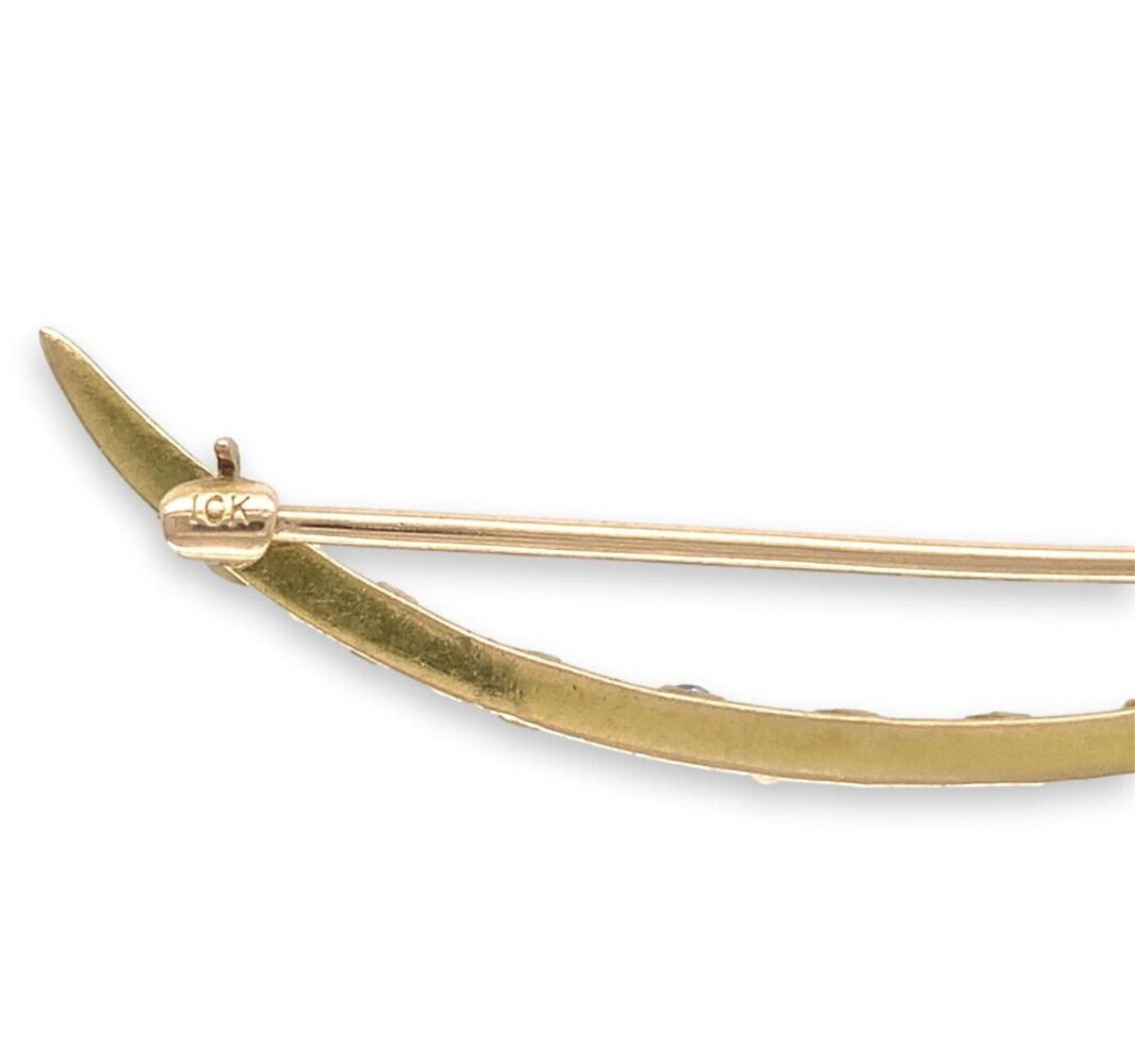 10K yellow gold antique crescent pin featuring eight round Montana blue sapphires and eight seed pearls. The sapphires are graduated in size and measure about 2.3mm to 1.9mm. The sapphires have light sky blue to cornflower blue color. One of the blue stones is replaced, probably paste (the squarish one 3rd from right). The pearls are graduated as well and measure about 2mm to 1.6mm.