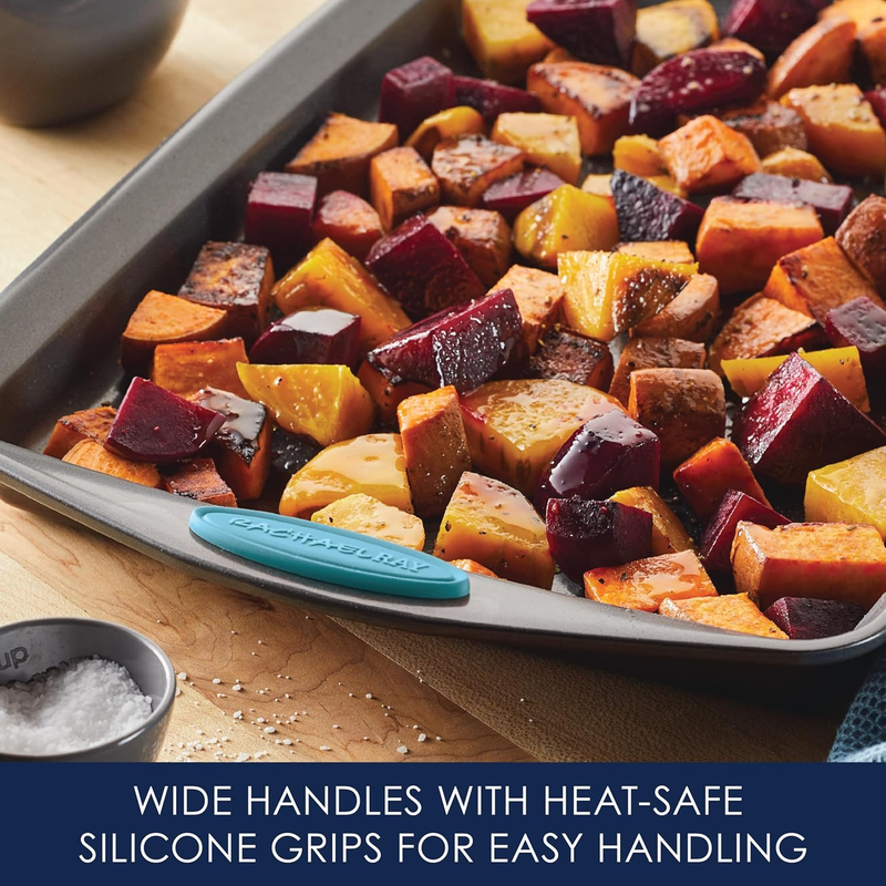 Offering three popular-sized nonstick baking pans, the Rachael Ray Bakeware 3-Piece Nonstick Cookie Pan Set is ideal for making both savory and sweet treats. These cookie pans are made from durable steel that resists warping and feature long-lasting nonstick that provides excellent food release and easy cleanup. With a small, medium, and large cookie sheet, enjoy the convenience of three sizes to do everything from using the set as roasting pans, broiling cheesy garlic bread, or baking Rachael?s Ranch-Style Potato Skins and yummy Kahlua Chocolate Chunk Cookies. The nonstick baking pans feature bold-colored, extra-wide grippy handles that provide a confident grasp when pulling items from the oven and are oven safe to 500F. These versatile cookie pans are the perfect complement to many other pieces in Rachael's bakeware and cookware collections that always spell fun in the kitchen. Hit a triple play with the Rachael Ray Bakeware 3-Piece Nonstick Cookie Pan Set that includes three durable baking pans for creating delish baked foods.