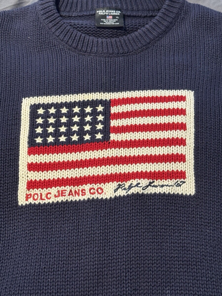 Show off iconic Americana style with this Polo Jeans Co. Ralph Lauren men?s XL flag knit sweater, a highly collectible piece that consistently turns heads and commands strong resale demand. Crafted in a deep navy cotton knit with the bold embroidered American flag graphic across the chest, this heritage-style sweater delivers peak Ralph Lauren nostalgia ? the kind people hunt for all year long.