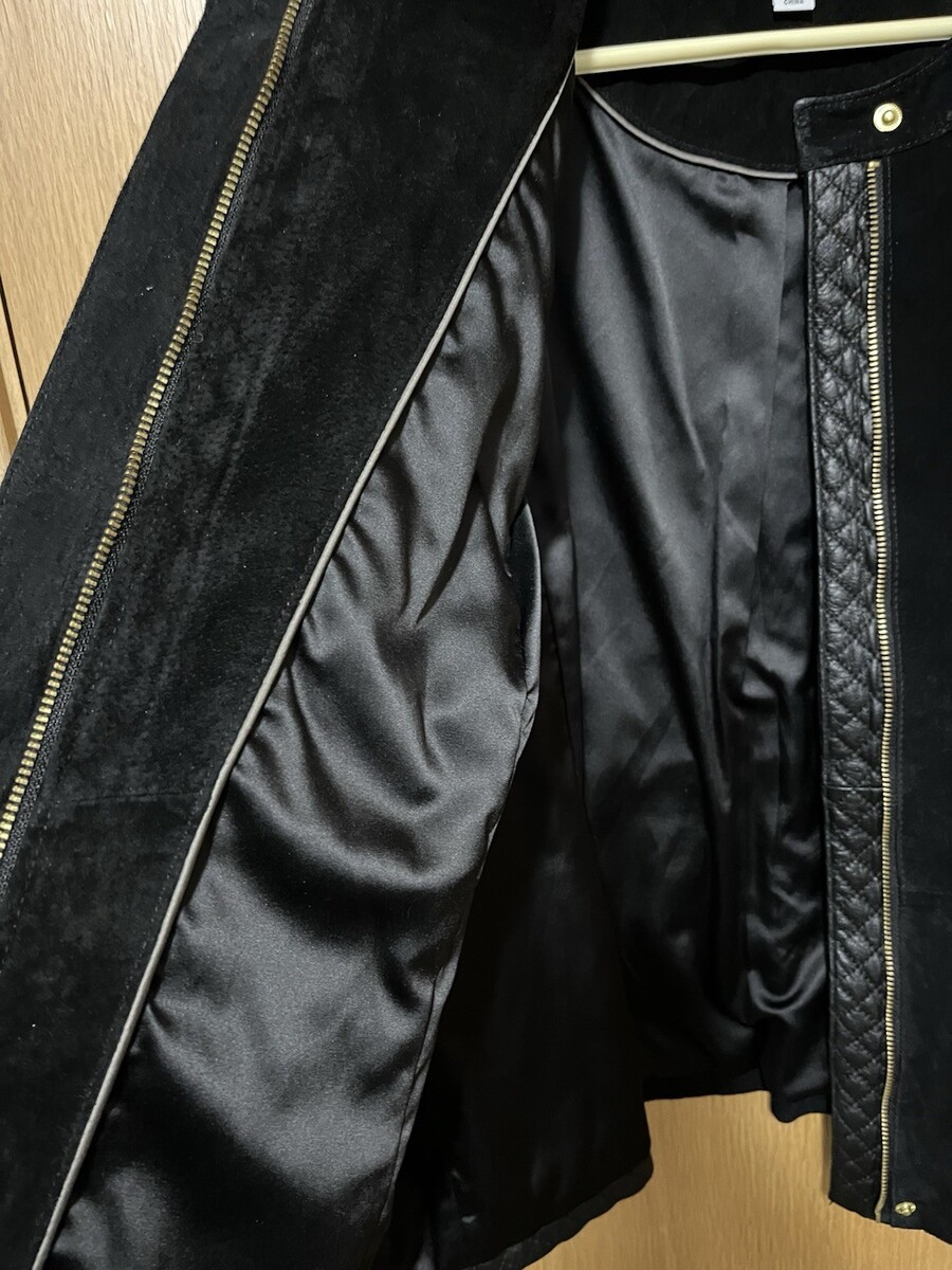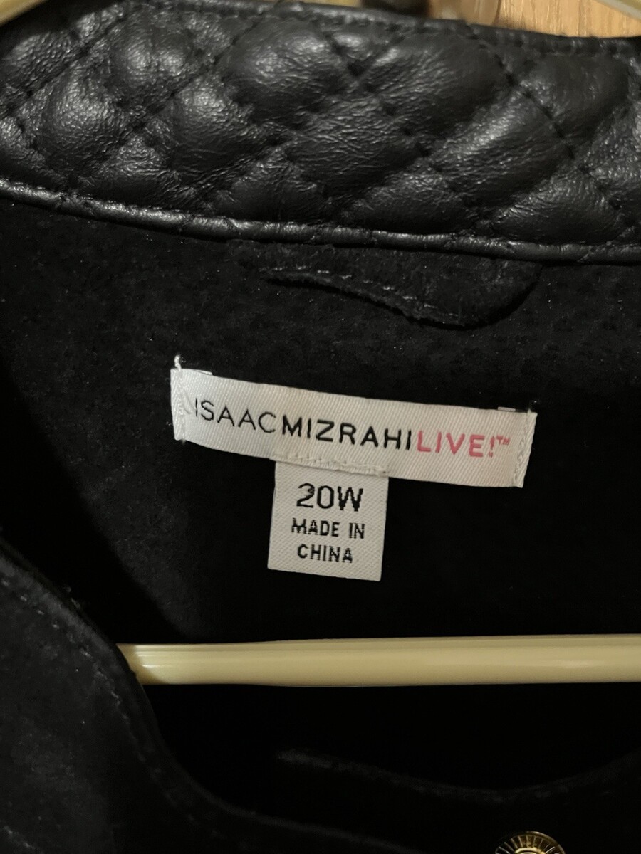 The product is a women's full zip black suede leather jacket in size 20W by Isaac Mizrahi. Made with leather outer shell material and a polyester lining, this short-length jacket features long sleeves, a zip closure, and a regular fit. It is suitable for all seasons and is recommended for dry clean only. The basic jacket style is versatile and can be worn in various occasions, adding a touch of sophistication to any outfit.