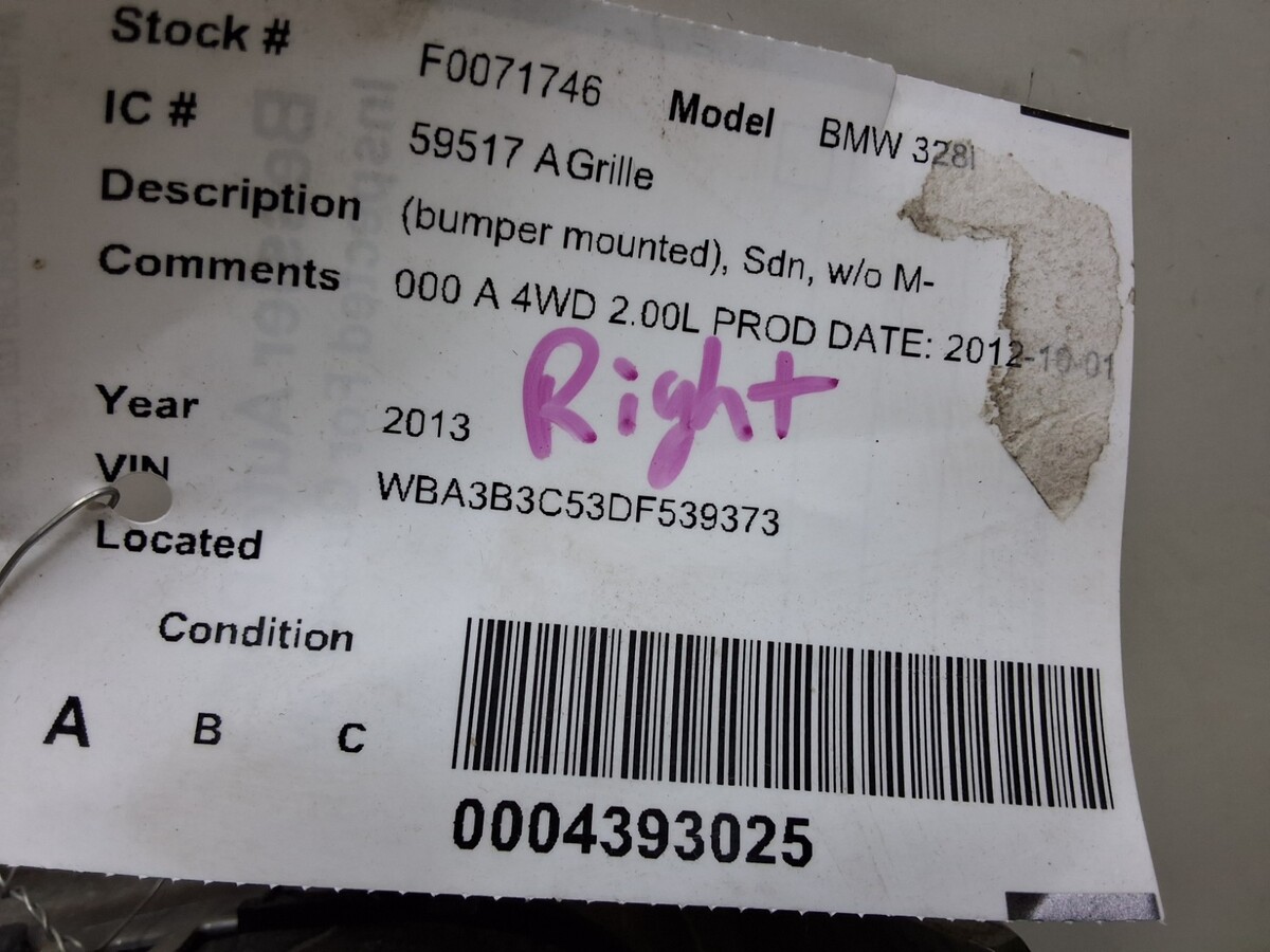 2012 to 2018 BMW 328i sedan right front passenger grill assembly.