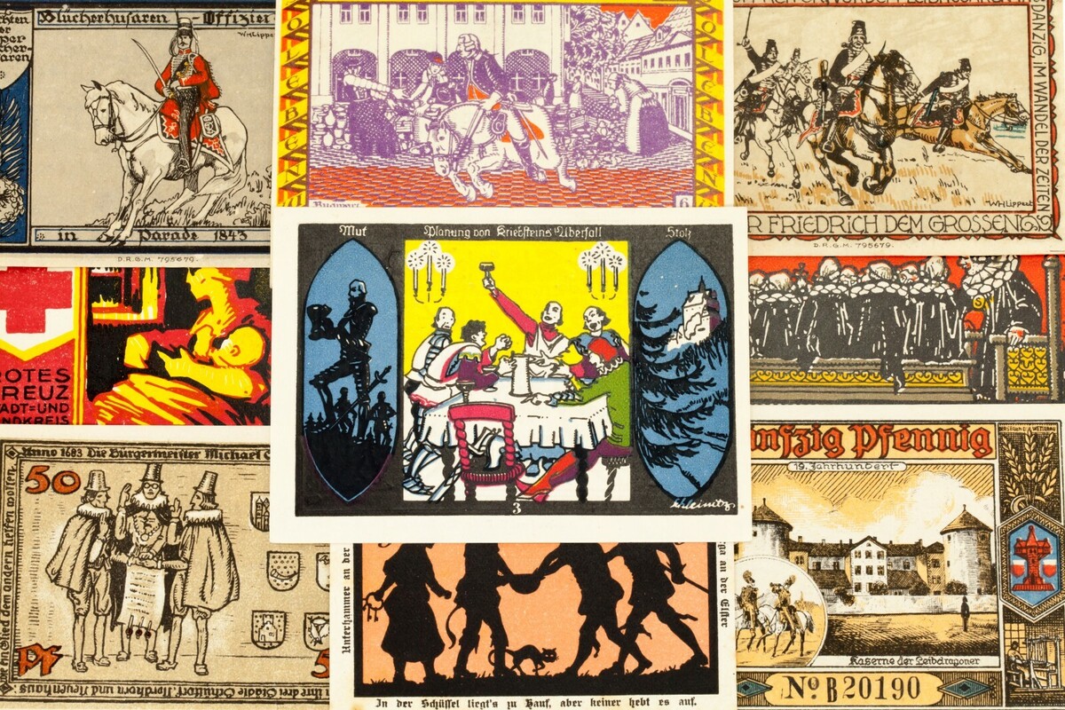 Dieses Los umfasst 25 einzelne Notgeleitungen aus Deutschland nach dem Ersten Weltkrieg. Alle sind in extra feiner bis unzirkulierter (xf-unc) Bedingung. Gesichtswerte zwischen 5 Pfennig bis 5 Mark. Militarthema.