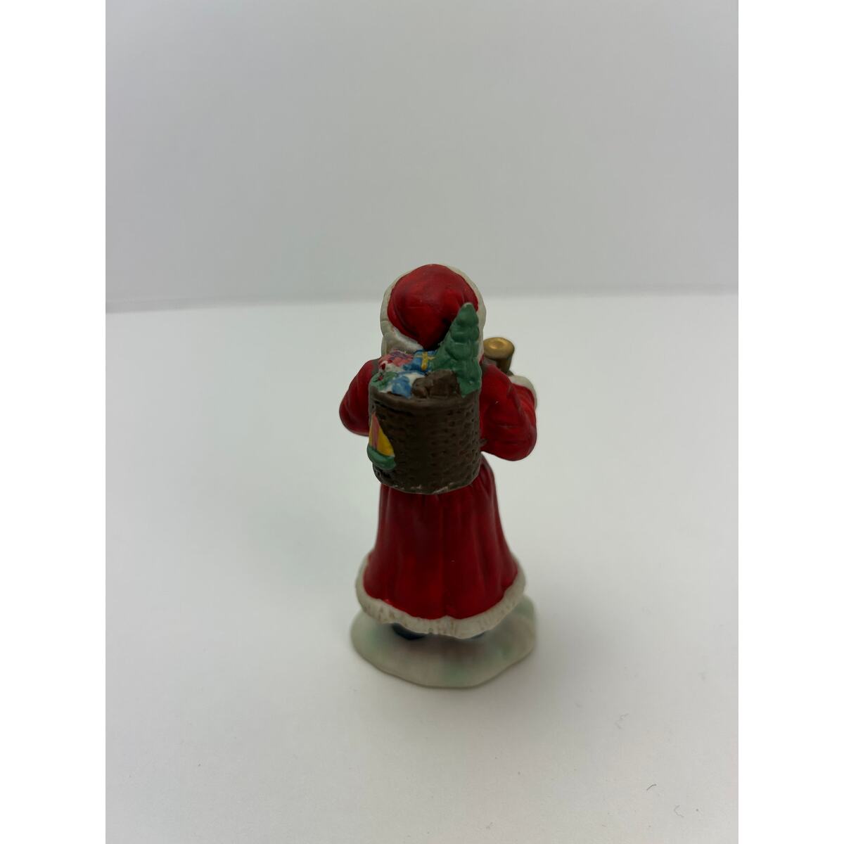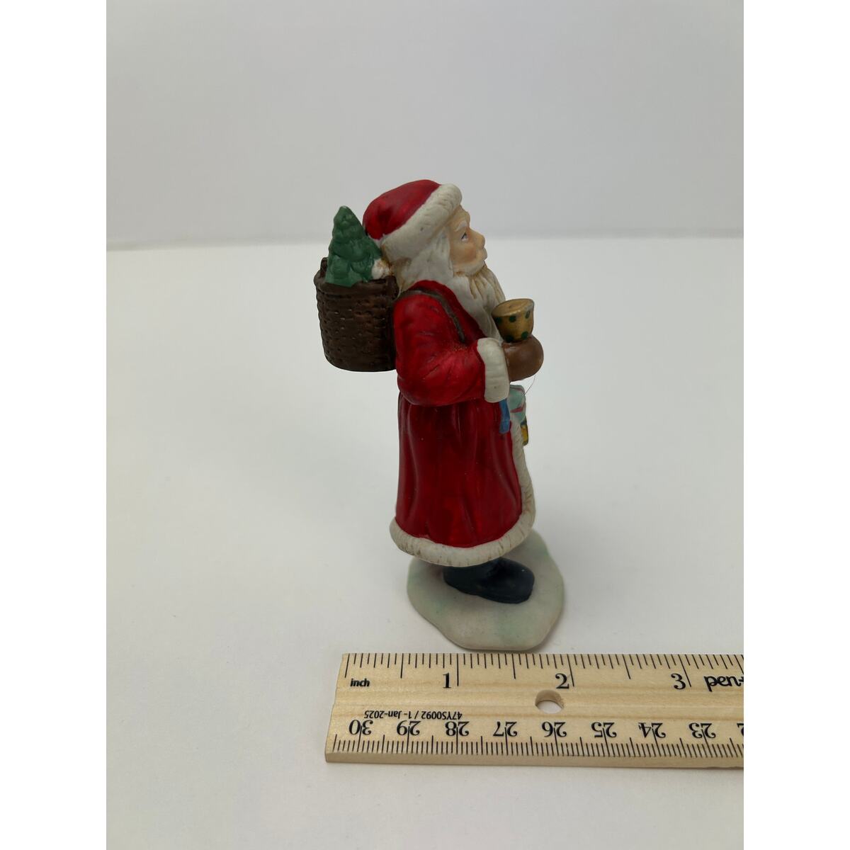 Hand-painted 4-inch ceramic Santa Claus figurine from the Christmas Traditions line. Depicts Santa in a red coat holding a cup, with toys and a tree in his pack. Comes with its original small red retail box showing moderate shelf wear. Stands freely and displays well for vintage-style holiday decor.