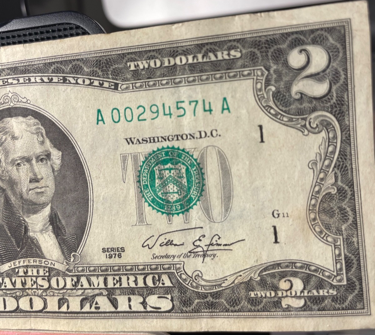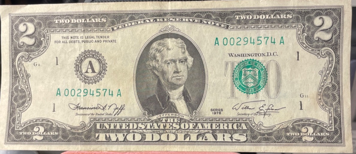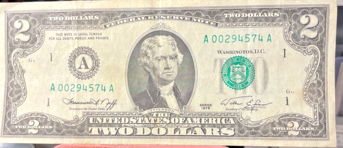 1976 $2 Bicentennial Bill low # A 00294574 A