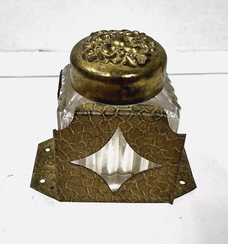Antique Small Inkwell Glass in Bright Gold Metal Holder Scroll Lid