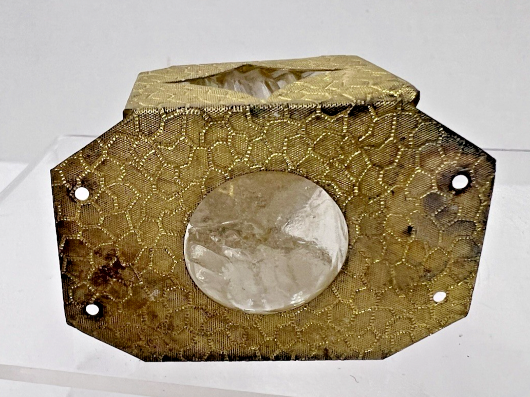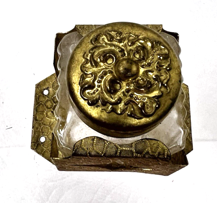 Antique Small Inkwell Glass in Bright Gold Metal Holder Scroll Lid the pressed gold metal has a place so you can nail this into a desk or someplace... the base measures 2 1/8 x 1.5 it stands just slightly less than 2 inches. The lid is hinged and as said the bottle has a few smaller chips under the beautiful cap/lid