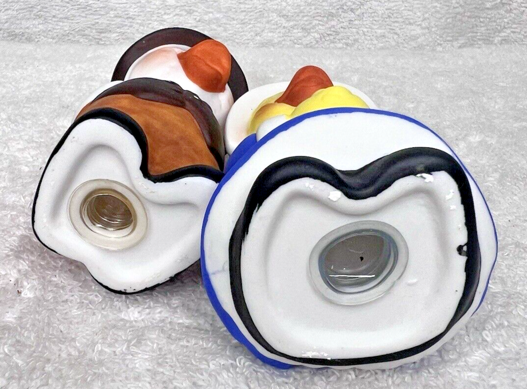 They seem to be never used perfect for the Thanksgiving table this year Mr. and Mrs. Pilgrim duck from Susie's zoo made a bisque porcelain they?ve never been used. He stands 4 1/4 inches tall