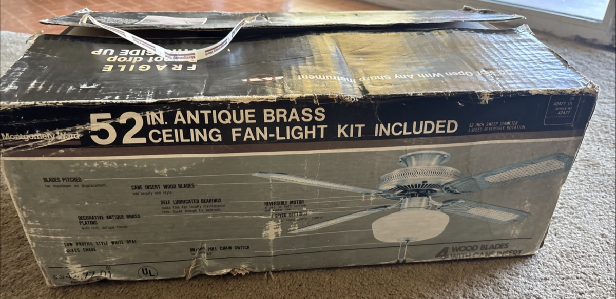 Montgomery Ward 52-inch, 4-blade ceiling fan with a antique brass finish Vtg...
