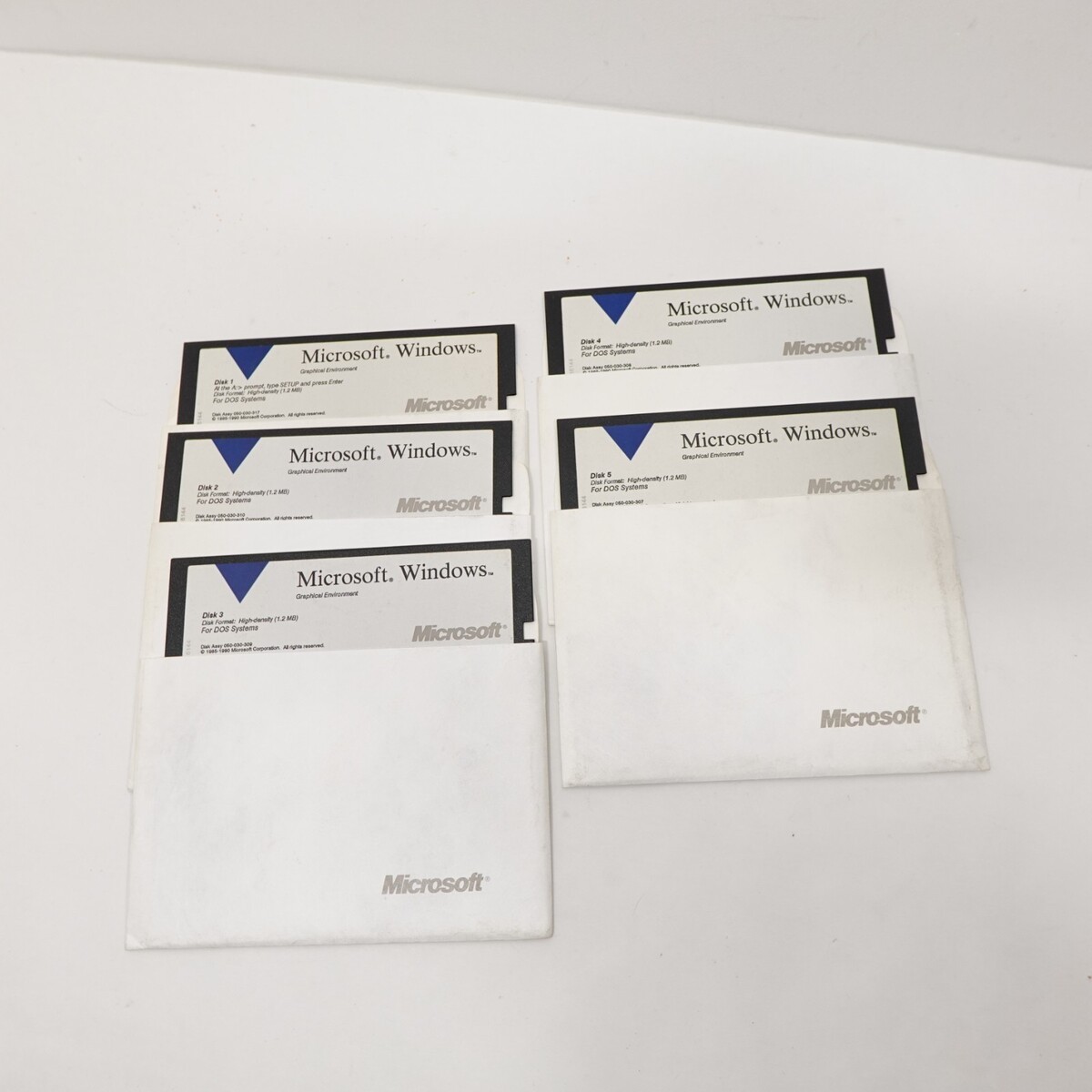 Vintage original Microsoft Windows 3.x installation floppy disk set for DOS, 5.25-inch format. Includes multiple disks as shown. These are original Microsoft floppies from early 1990s era computing. Great for collectors, restorers, period-correct PC builds, photography props, or display.