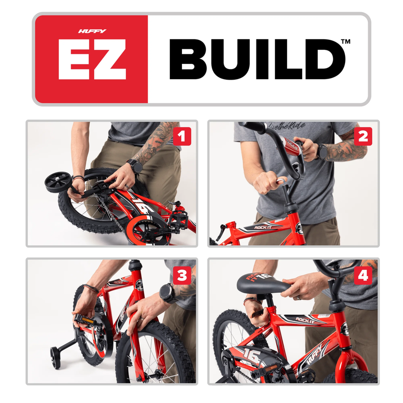 The Huffy Rock It 16" Boys? Bike is perfect for adventurous young riders aged 4 and up. Its bold red design with energetic graphics gives the bike a dynamic look, while the durable steel frame ensures lasting strength. The padded seat and handlebar pad provide extra comfort, making every ride more enjoyable. Assembly is quick and easy, so your child can start riding right away. This single-speed bike is built for fun, whether cruising through the neighborhood or exploring the park. Designed for style and durability, it?s an excellent choice for any young adventurer ready for action. The bike also features sturdy training wheels to help beginners gain confidence as they learn to ride. Parents will appreciate the quality and safety features, while kids will love the freedom and excitement it brings. From Huffy, We Make Fun!