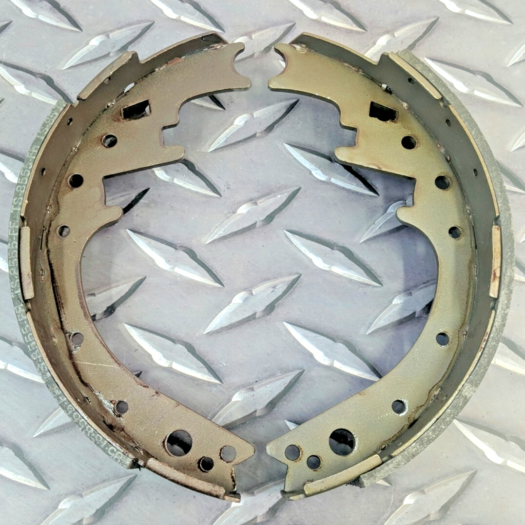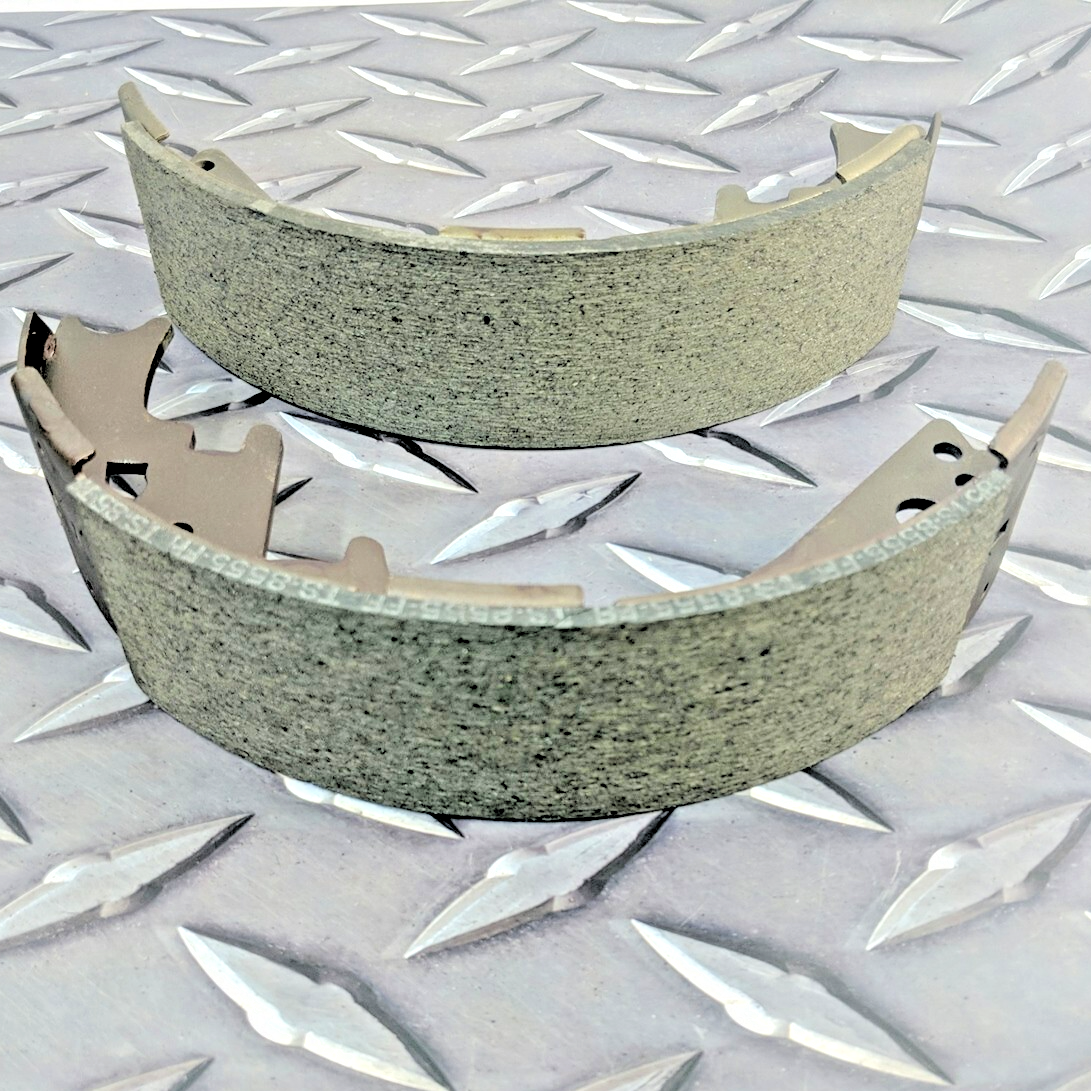 Exact item set is shown. New old stock organic brake shoes with partial packaging. Includes the pins shown. Set weight 7.5 lbs. 11 inch drum diameter, 2.5 inch shoe width. Made in USA. No returns on installed items or partial sets. Please review our business policies in our store for information regarding returns, shipping and warranties. Please review our business policies in our store for information regarding returns, shipping and warranties.