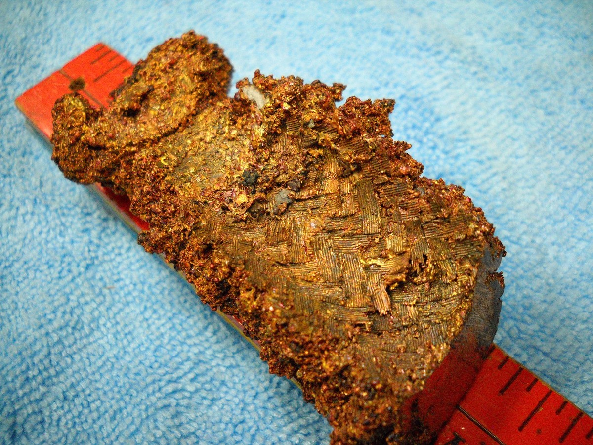 These are random pieces of copper that "boiled" out of the Smelter Crucible when pouring the 740# Copper T-shirt Anodes that were then loaded onto a train car for refinement at another facility.