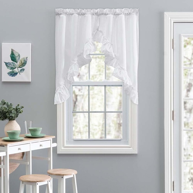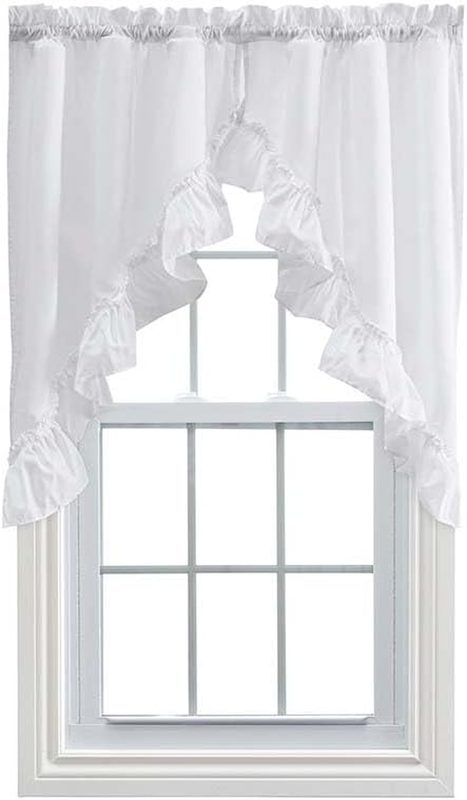 Ellis Curtain Stacey ruffled swag-bring beauty and a brand new look into your home decor with the Stacey curtain program. The popular solid colors coordinate easily with a variety of other solids, Checks, Plaids, and stripes without over powering them. The Stacey ruffled swag is engineered form a lighter fabric that is designed to allow some light in while providing privacy. Made with 70-percent polyester/30-percent cotton fabric creates a smooth draping effect, soft texture and easy maintenance. Stacey ruffled swag is constructed with a 1.5-Inch rod pocket, decorative 1.5-Inch header. Width is measured overall 60-inches, length is measured 38-inches from header top (ruffle above the rod pocket) to bottom of valance. For wider windows simply add multiple swags together on the same curtain rod. Machine washable.