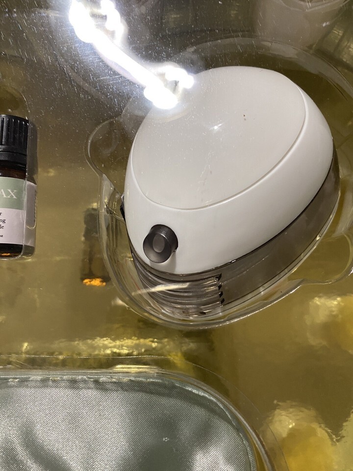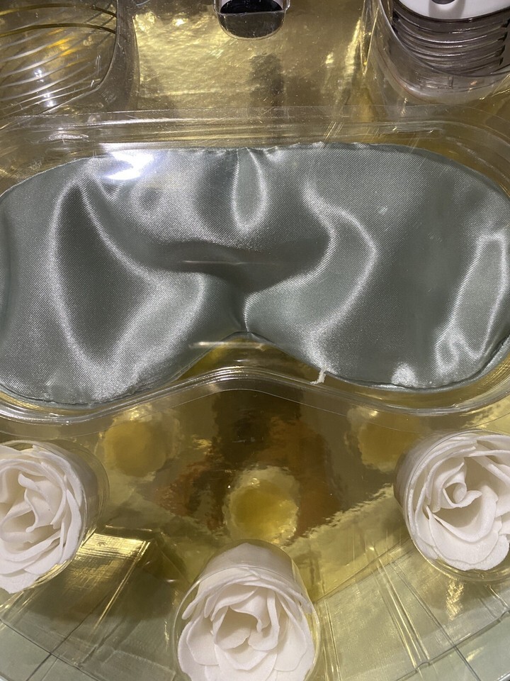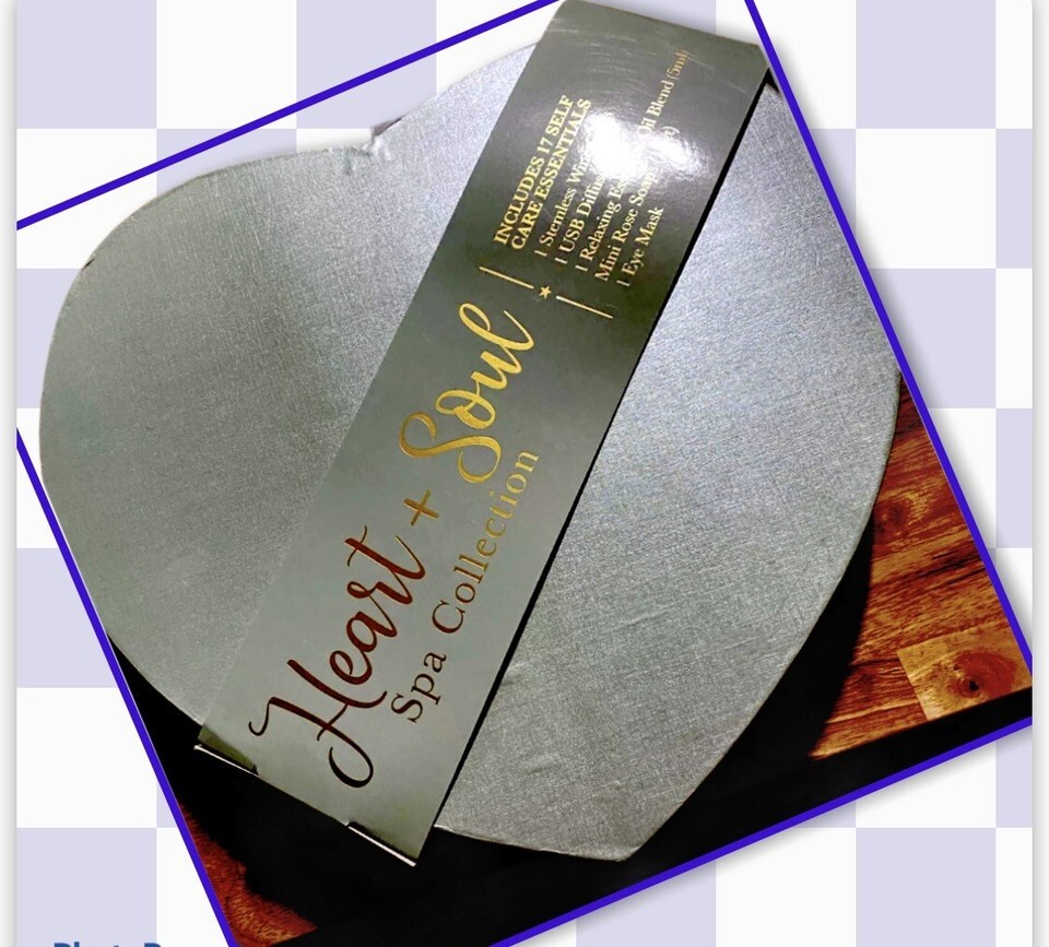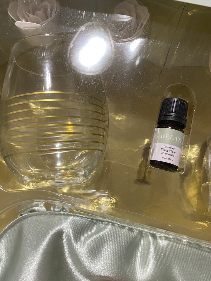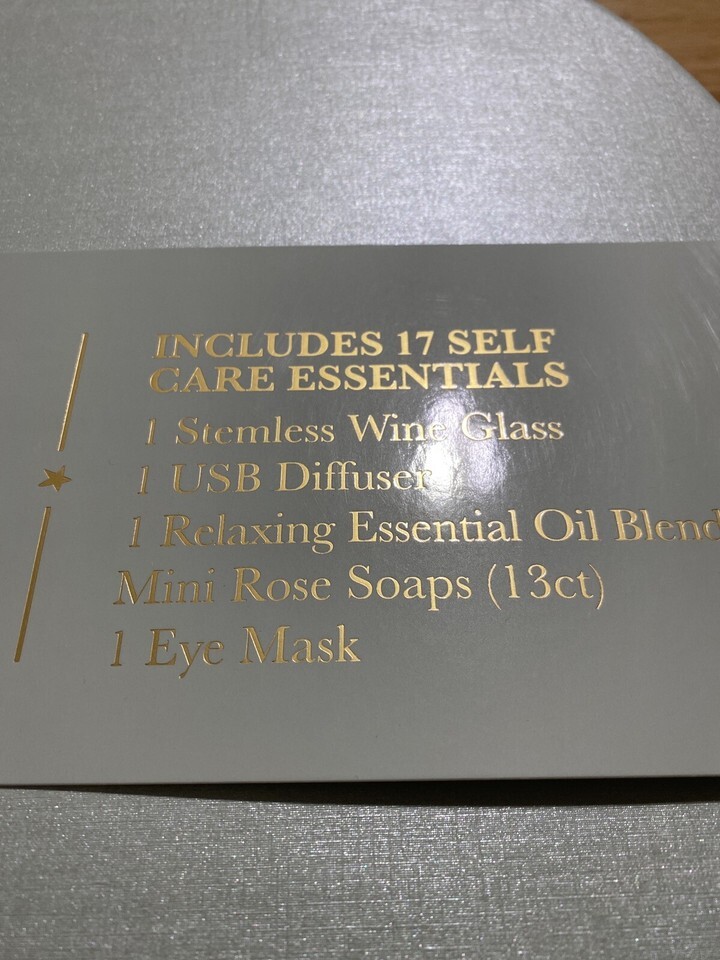 Excellent piece in a beautiful mint green heart shaped box. 17 piece collection includes a stemless wine glass, a USB essential oil diffuser, relaxing essential oil blend with lavender, 13 pieces of rose shaped hand and body soap, and a satin sleep mask.