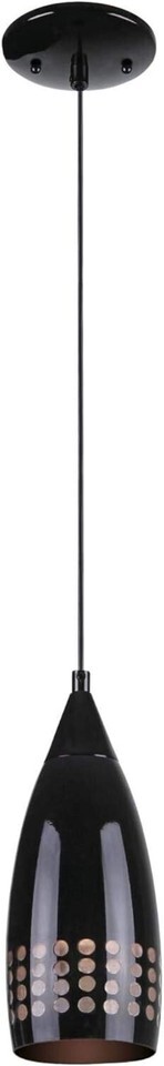 The Westinghouse Percy 6100900 Adjustable Mini Pendant is a sleek and contemporary lighting solution that adds a stylish touch to any space. Perfect for modern or transitional decor, this pendant features a black glass shade with a decorative perforated circle pattern, suspended from a black cord and round canopy. Its versatility allows it to be used in various settings such as kitchens, dining rooms, bedrooms, offices, and commercial spaces like restaurants and hotels.