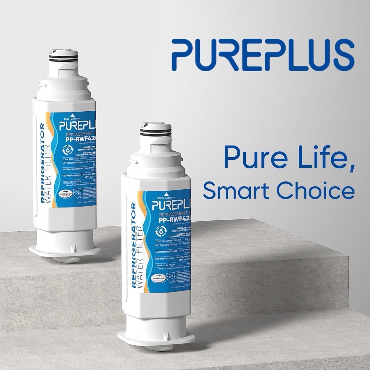 PUREPLUS PP-RWF4200A refrigerator water filter 3-pack. Compatible replacement for Samsung DA97-17376B, HAF-QIN, and multiple French-door refrigerator models. Features advanced coconut-shell activated carbon, delivering 0.5-micron filtration that reduces chlorine, sediment, rust, odors, VOCs, and select heavy metals.