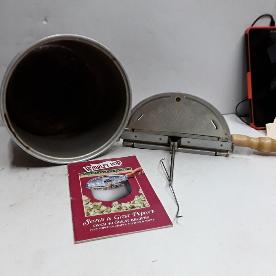 Used Whirley Pop aluminum popcorn maker with recipe book. Good working condition probably need to good cleaning.