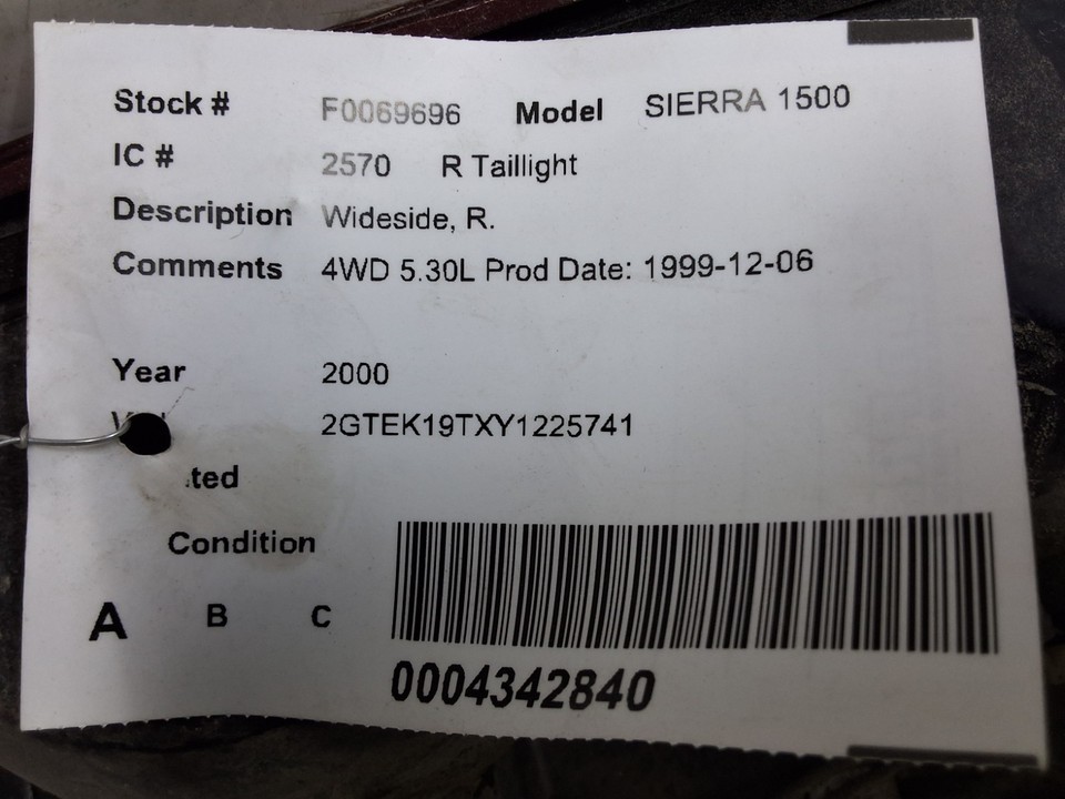 1999 through 2002 Chevrolet Silverado, 1999 through 2003 GMC Sierra right passenger side tail light assembly.