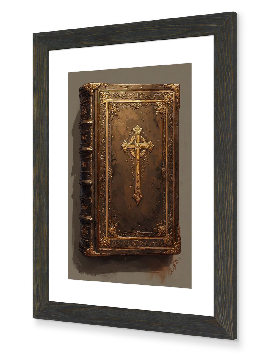 Holy Bible with an ornate, antique design. The cover is adorned with intricate gold engravings, floral motifs, and an elegant central cross that radiates reverence and craftsmanship. The weathered texture of the leather suggests generations of devotion, yet its regal detailing preserves an air of untouched majesty. Warm, subtle lighting highlights every carved line and metallic embellishment, giving the book an almost divine glow. Perfect for spiritual collectors, art lovers, or anyone drawn to pieces that carry depth, history, and elegance, this image embodies both faith and fine artistry—making it a striking addition to any sacred space or refined gallery wall.