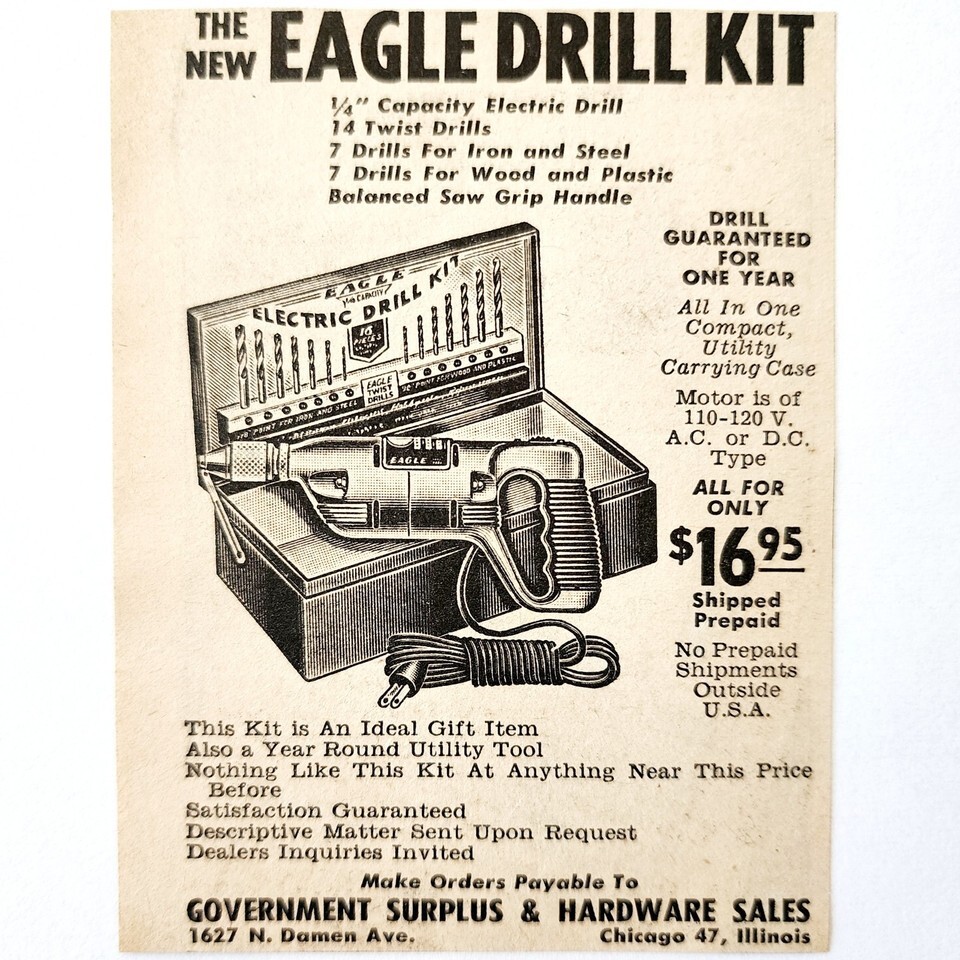1947 Eagle Drill Kit Power Tools Advertisement Vintage Govt Surplus Hardware E8H