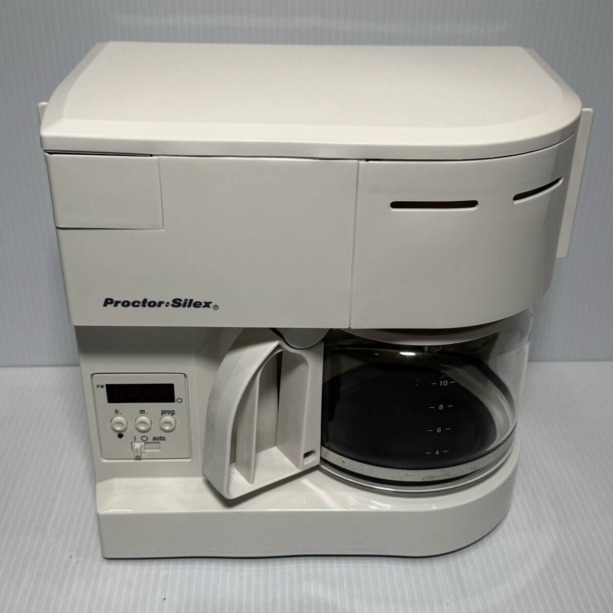 The Proctor Silex Under The Cabinet Coffee Maker Model #44401 in white is a compact and efficient filter coffee machine that can brew up to 12 cups of ground coffee.