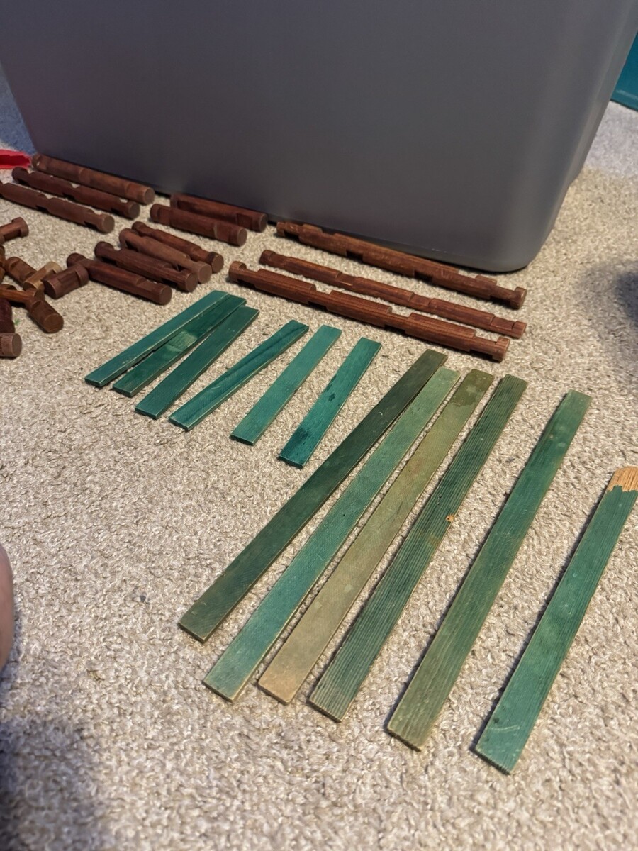 This lot includes a variety of log lengths, green slats, red roof pieces, a yellow chimney block, and all other pieces shown in the photos. Everything pictured is included.