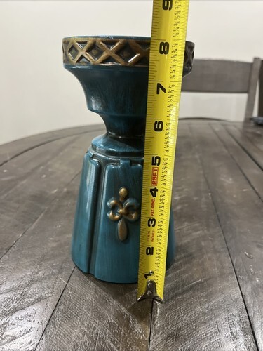 Add a touch of elegance to your home decor with this vintage Haeger Pottery candle holder. The turquoise blue and gold column design is a stunning addition to any room. Made of high-quality ceramic, this candle holder is perfect for holding pillar candles and creating a warm, cozy atmosphere. The production style of this candle holder is art pottery, and it was made using traditional pottery techniques in the United States. This Haeger Pottery candle holder is a unique and beautiful piece that will surely become a cherished addition to your collection.