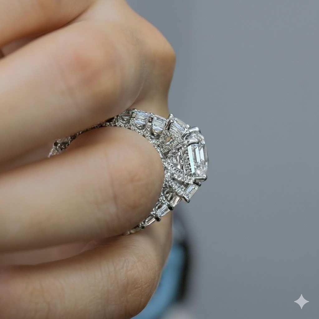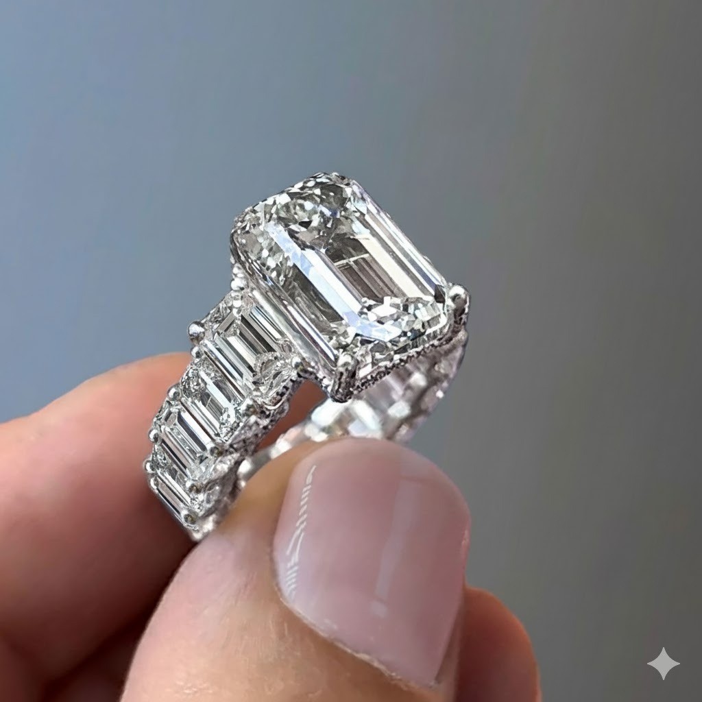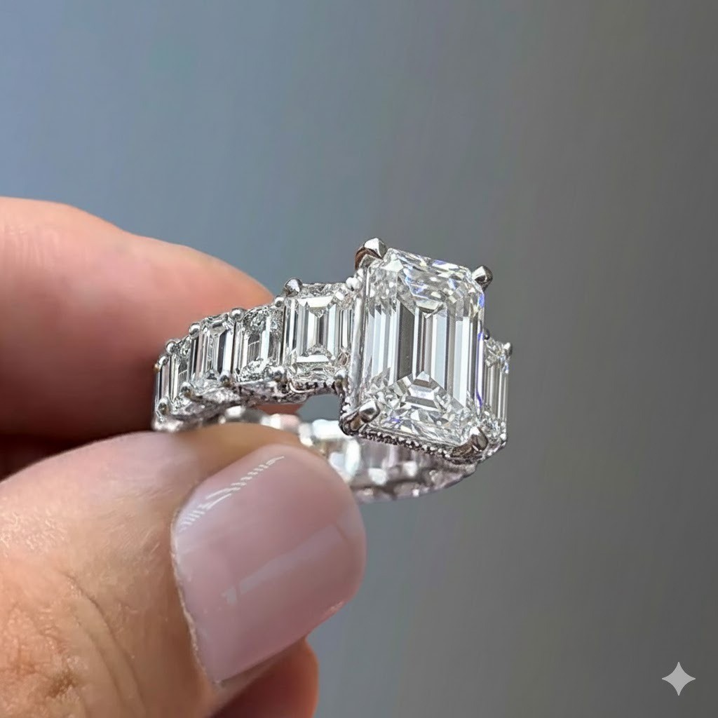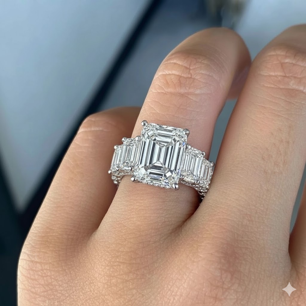 Lab Grown Three Stone 4.40 CT Emerald Cut F VS1 Engagement Ring with Hidden Halo
