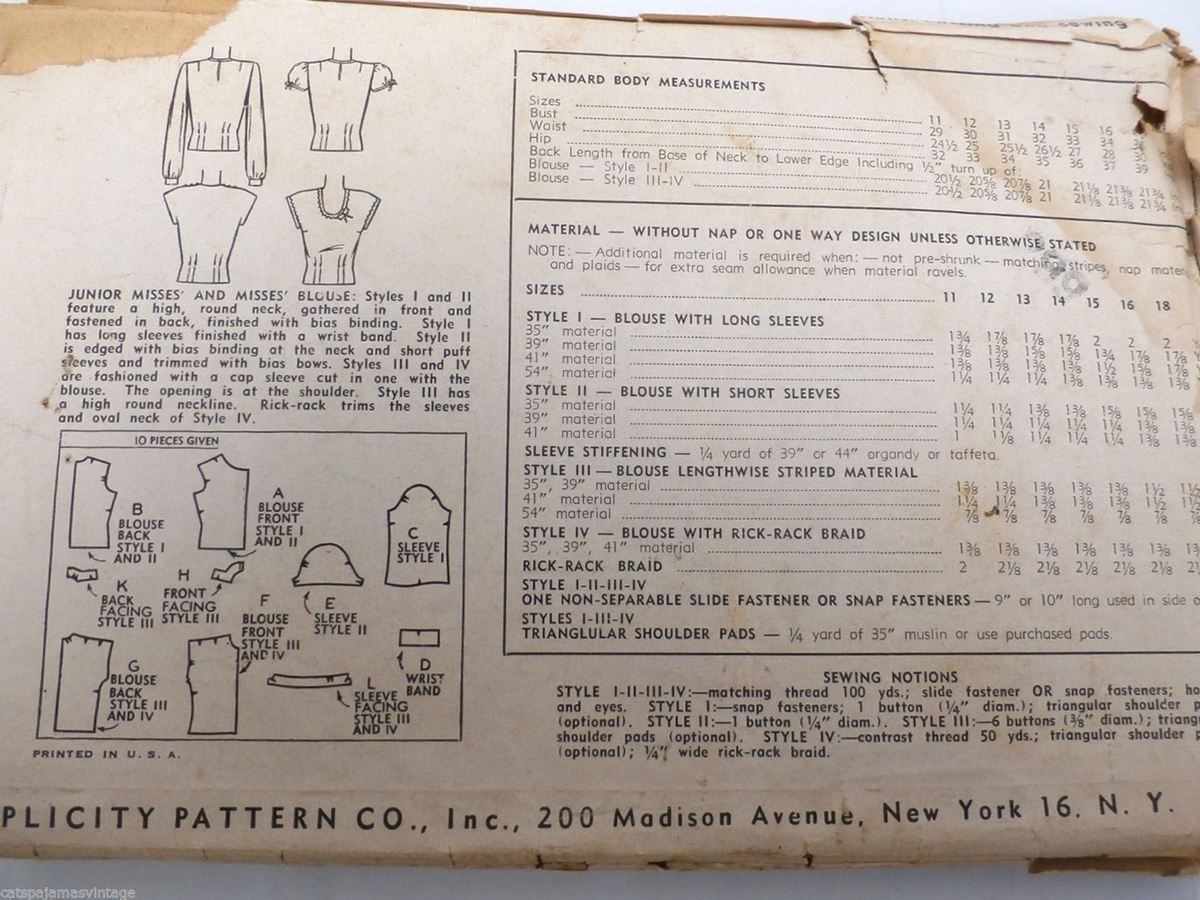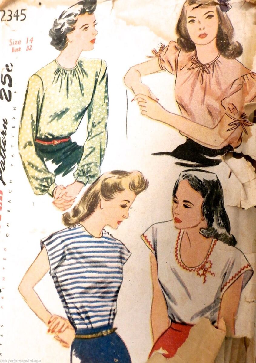 Vtg retro 1940s Sewing Pattern Simplicity #2345 Blouse 4 Ways Size 14 Bust 32