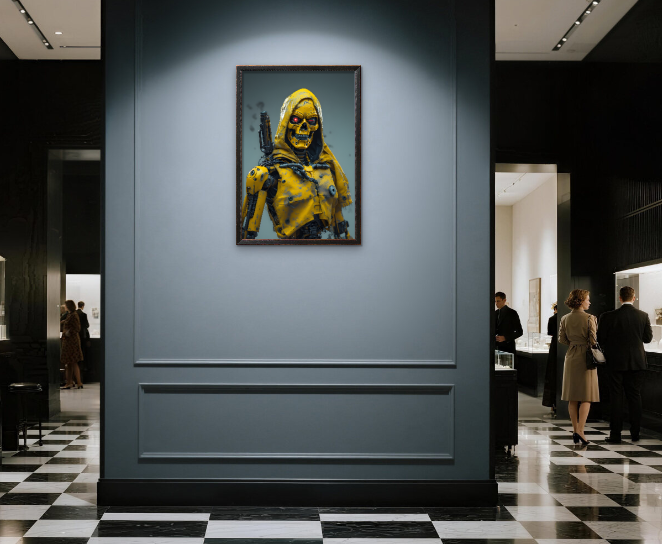 This striking artwork captures a post-apocalyptic combat android wrapped in a tattered yellow hood, blending the intimidation of a skeletal war machine with the quiet presence of a lone wanderer. Its glowing red eye pierces through the haze, revealing a machine that has survived battles, decay, and time itself. Scratches, dents, and exposed servos highlight the raw realism of a robot built for war but shaped by survival.