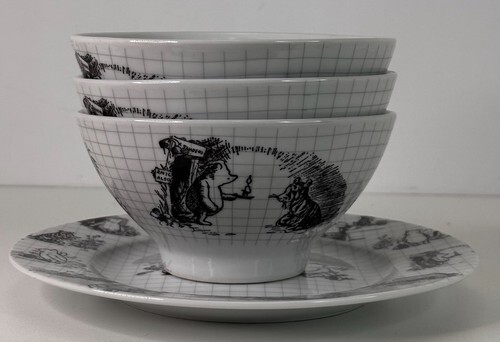This product is a set of 3 dinnerware pieces featuring Winnie the Pooh sketches from the Disney Zrike Sketchbook collection. The set includes 1 salad plate and 3 cereal soup plates, each measuring 5.5 inches in size. The dinnerware is branded by Disney and is part of the Winnie the Pooh franchise. These pieces are contemporary collectibles manufactured in China and are unmodified. Perfect for Disney enthusiasts and collectors, this dinnerware set adds a touch of whimsy and charm to any dining experience.