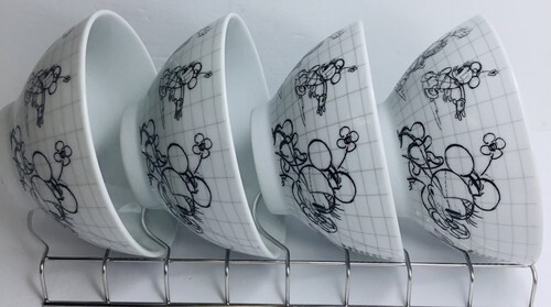 This set of four Disney Minnie Mouse Cereal Bowls Sketchbook Soup Snack Ceramic Dishes is the perfect addition to any Disney fan's collection. The bowls feature Minnie Mouse and are perfect for serving soup or cereal. The sketchbook design adds a touch of whimsy to your table setting.