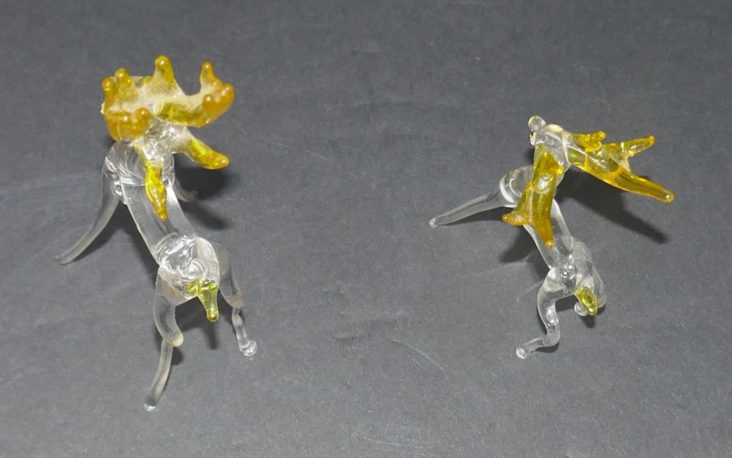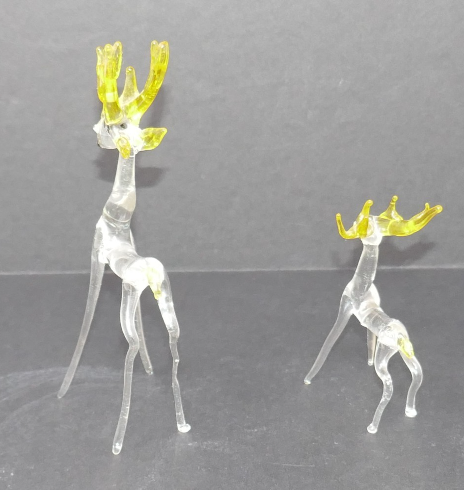 This vintage pair of hand-blown art glass figurines will make a striking addition to any Christmas decor collection. Made of clear glass with yellow antlers and tail, these figurines showcase intricate hand-blown craftsmanship. The large deer measures approx. 5" tall. Perfect for collectors of decorative pottery and glassware, these figurines capture the beauty and elegance of a bygone era, with a timeless theme of deer and reindeer.