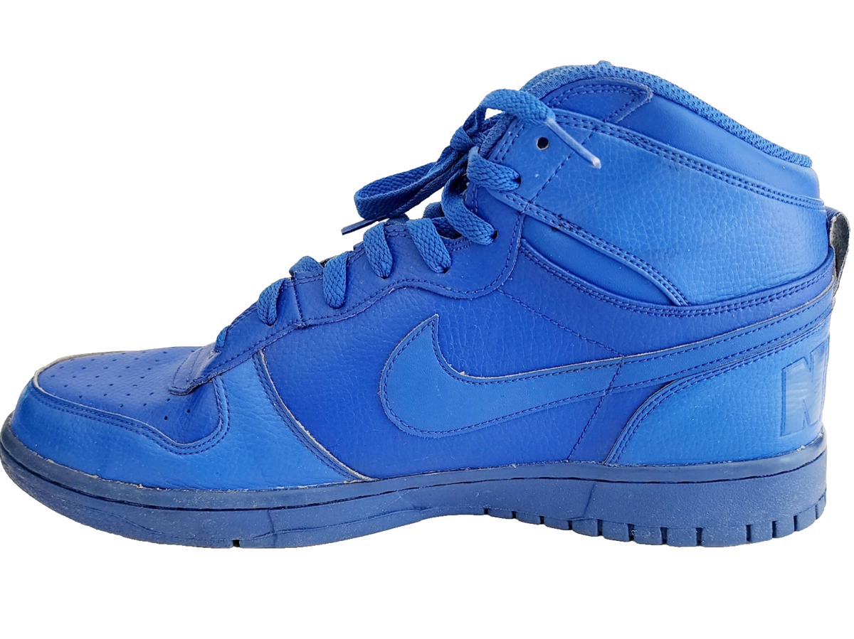 Uppers: Solid blue leather with Nike swoosh on sides. Some normal creasing from wear and light scuffing present. Colors remain strong.