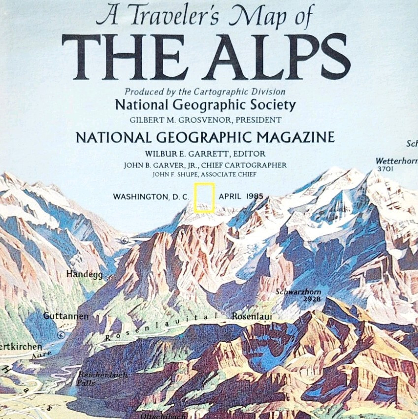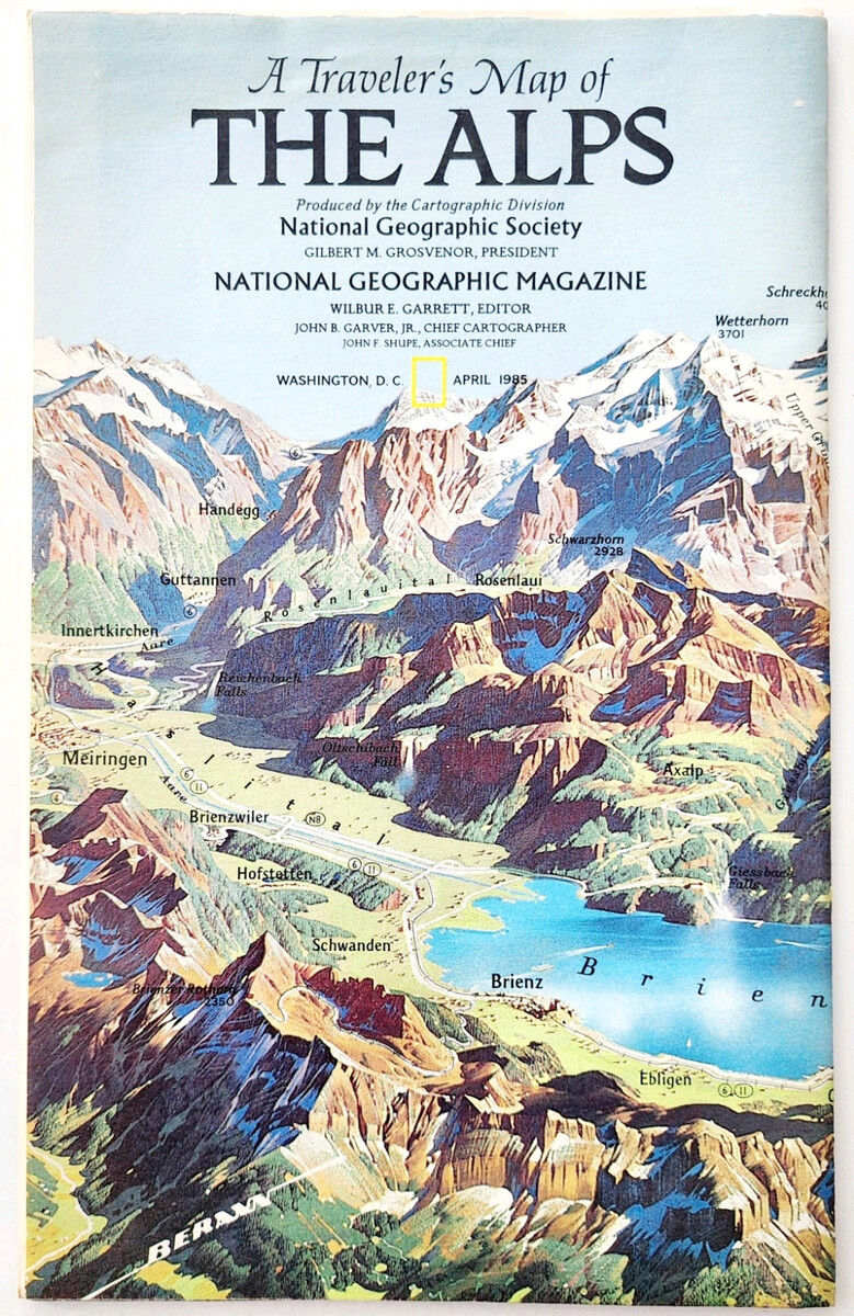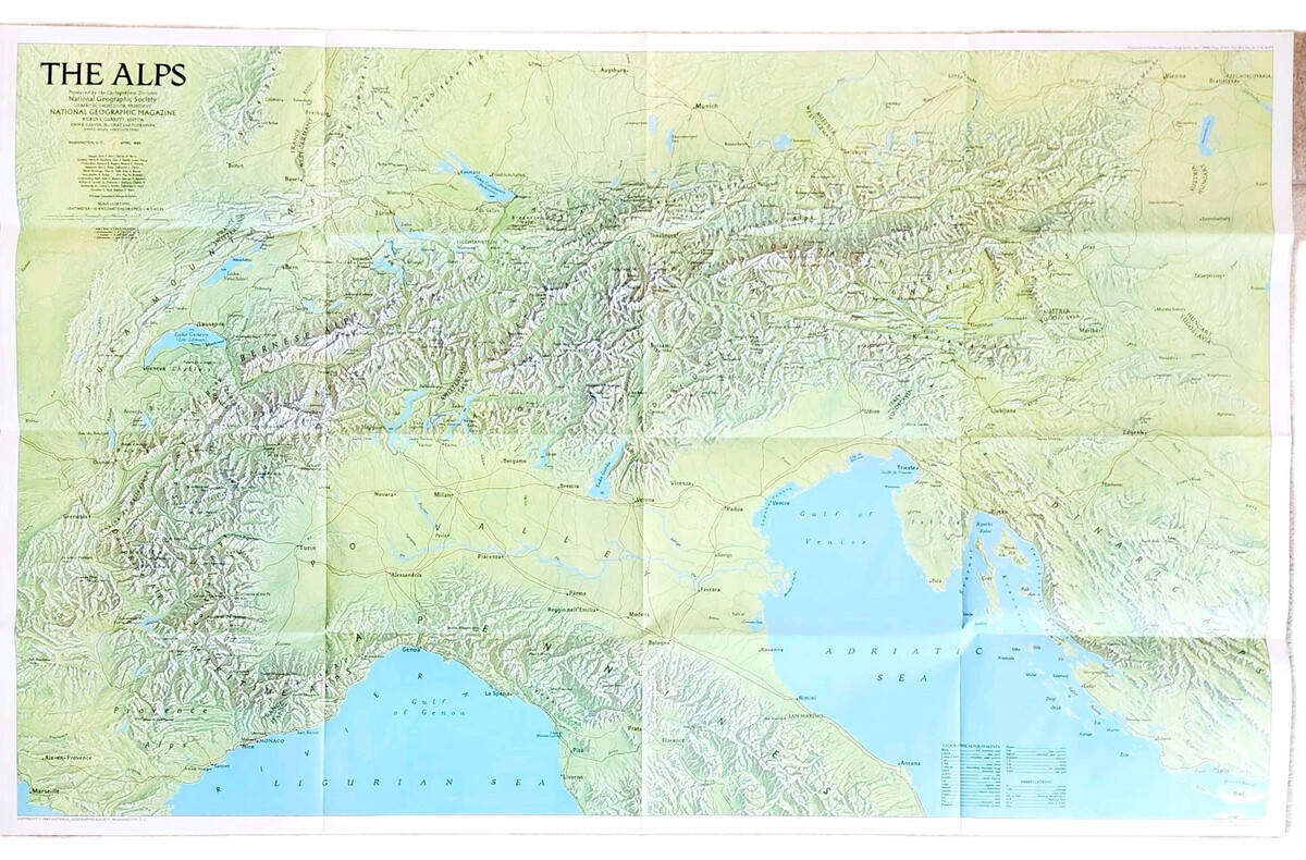 1985 The Alps Mountain Range Map Nat Geographic Double Sided 36 x 22.5" E6A