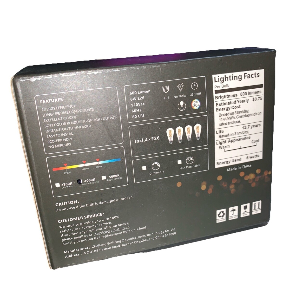 The 4-Pack Dimmable Vintage LED Edison Bulbs by EMYMLITE are a stylish and energy-efficient lighting solution for your home. These E26 LED bulbs provide a neutral white 4000k light shape, equivalent to a traditional 60 watt bulb. With the added feature of being dimmable, you can easily adjust the lighting to your desired brightness level. These LED bulbs are a great choice for adding a warm and cozy ambiance to any room in your home.