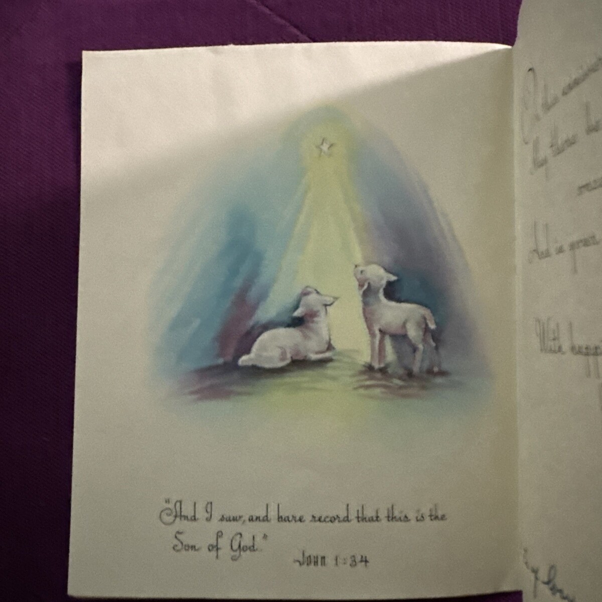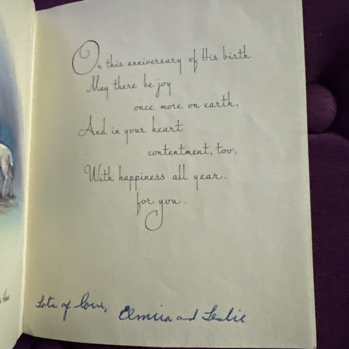 The product is a vintage Christmas greeting card featuring an embossed image of the Holy Family and a Christ child from the 1940s. This collectible paper item is perfect for those who appreciate retro and nostalgic seasonal decorations. The vintage design adds a unique and timeless touch to the traditional Christmas occasion, making it a special and charming way to send holiday greetings.