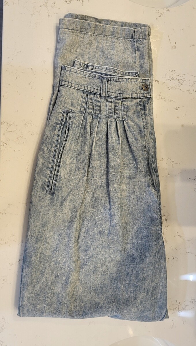 100% cotton, acid washed lightweight pants. Super high rise (14 inches), pleated, baggy, tapered leg, 29 inch inseam, approx 29 in waist.