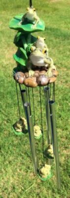 ? The sun is high and hot in the summer afternoon, and Mama frog knows just how to enjoy it to the fullest with her babies. Crouching by the pond on the rocks, mama frog has her babies on her back and on lily pads nearby. This beautiful scene crafts the crown part of the wind chime. Aluminum rods and small frog family ornaments hang down from the wind chime's crown.