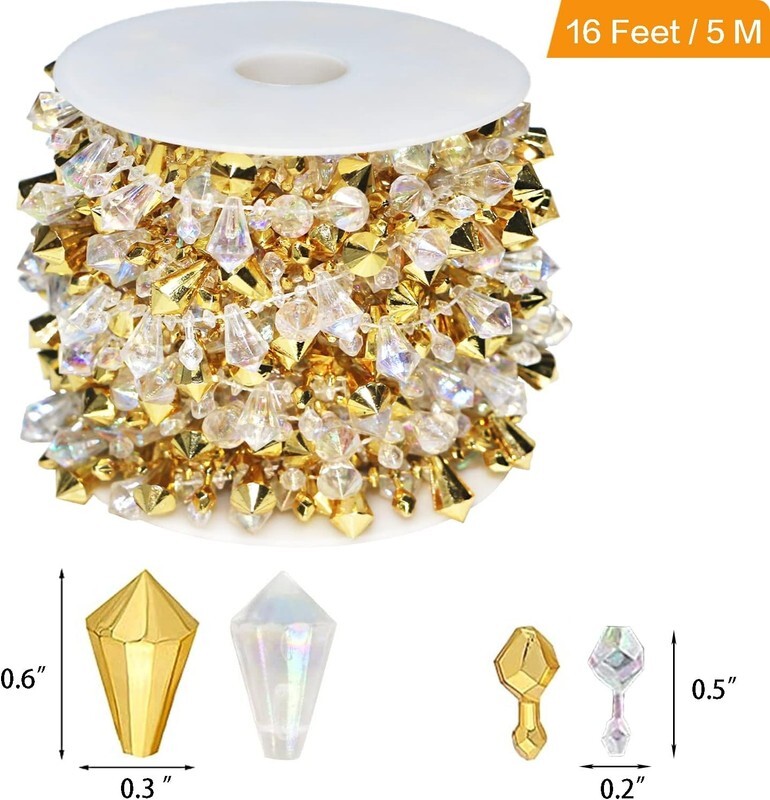 16 FEET ROLL SET: 16ft (5m) long Christmas clear iridescent and gold bead garland - Twisted design twinkly strings of beads - The size of the Large beads are 15 x 9 mm, the small beads are 12 x 5 mm. 16 Feet is enough for a lot of cover on your tree or in your home and room.