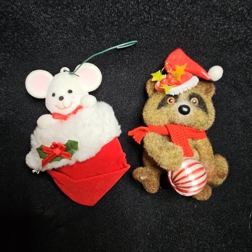 Vintage Flocked Raccoon and Mouse Christmas Ornament Lot Forest Creature Figure