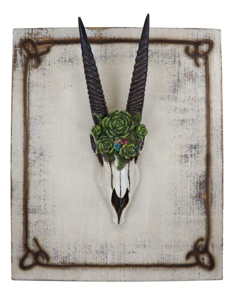 ? Update the look of your study or casual sitting room. The wall mounted resin gazelle skull is carefully handcrafted to give a "real" look to them. Green floral roses are added to the temple of the skull to give vibrant colors and appeal to the accent. The skull is mounted on a wooden board, painted and finished in distressed look and then bordered with dark symmetrical patterns.