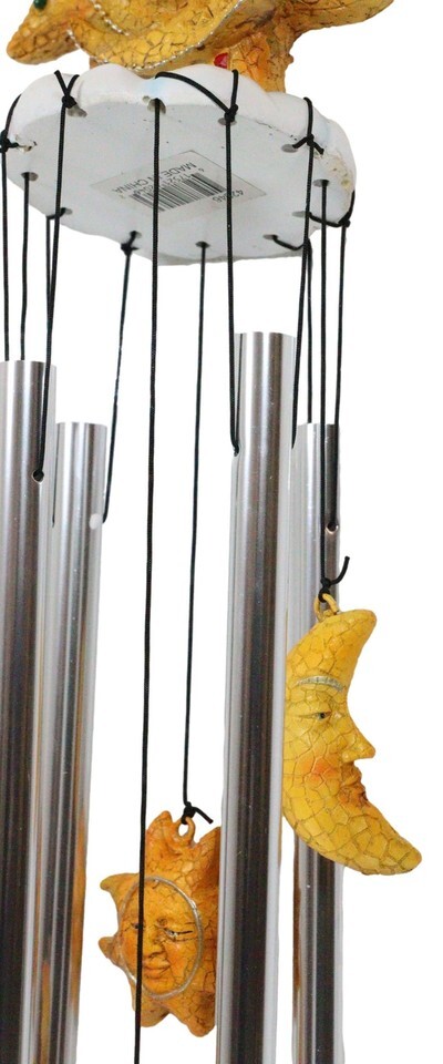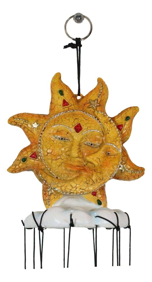 ? This Vibrant Mosaic Sun And Moon Decorative Wind Chime is made of designer composite resin, hand painted and polished individually. The rods are aluminum. Color Tone may vary slightly from pictures.