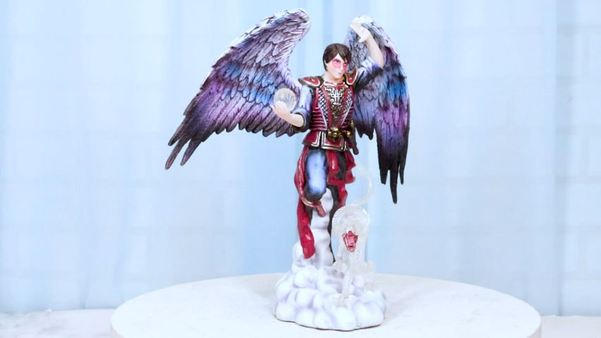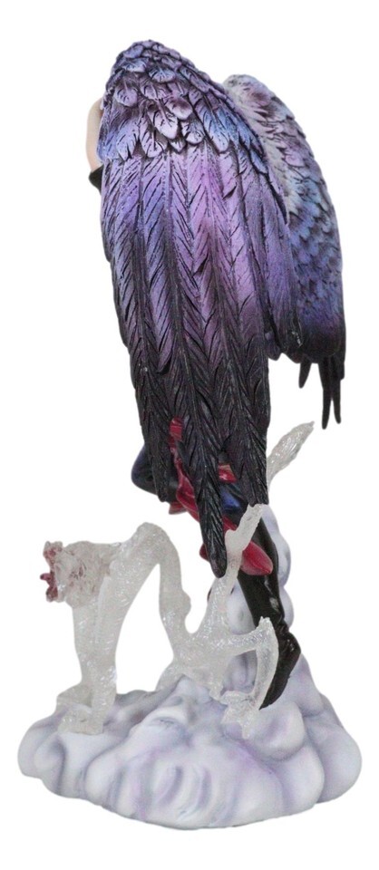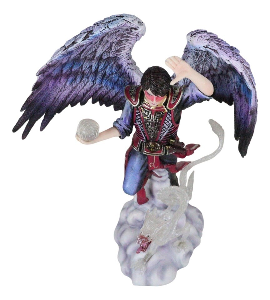 ? Summoning the forces of the air, the wizard in this figurine raises one hand while balancing a transparent sphere in the other. The intricate outfit, reminiscent of a samurai, is adorned with rich colors and armor, and feathered wings in shades of purple and indigo spread out to either side. Perched atop a cloud, the sorcerer is joined by a magnificent air dragon with gleaming white scales and an open mouth, poised for battle.