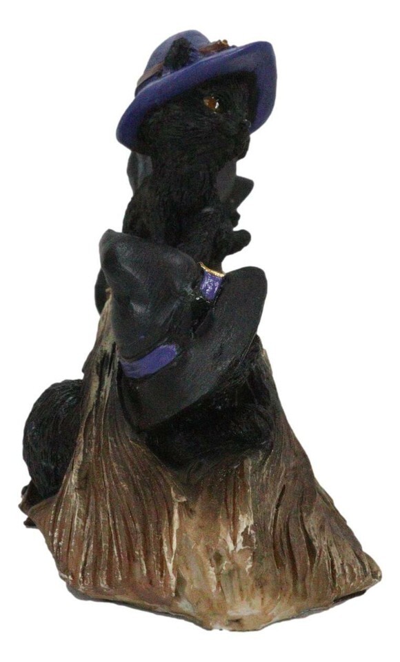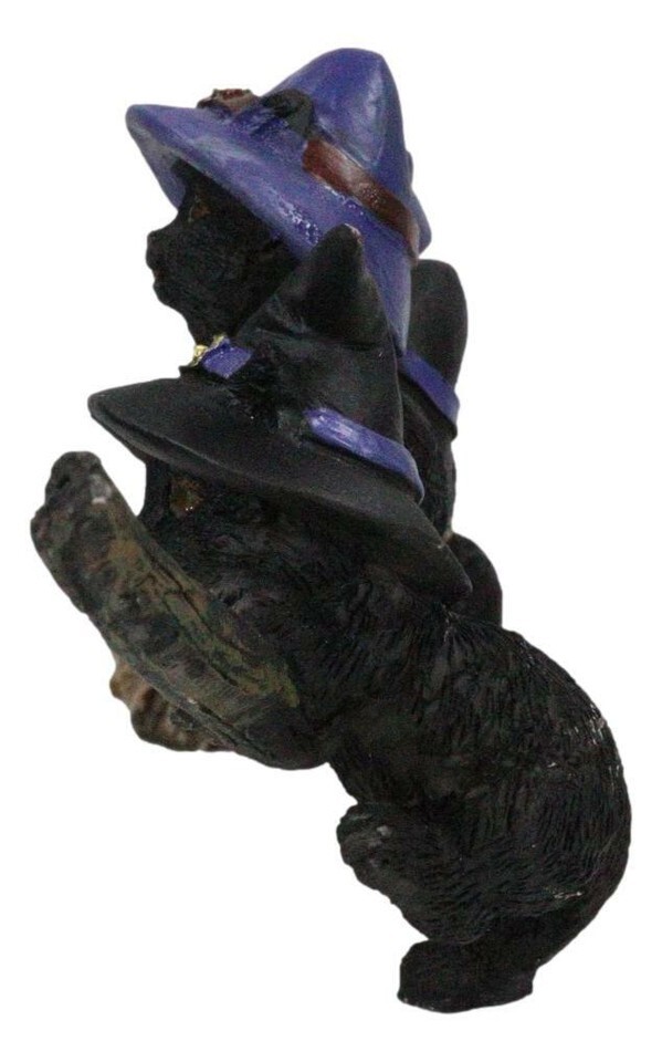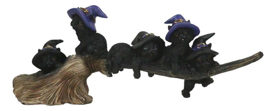 ? 5 realistic lifelike black cat kittens are featured in this adorable figurine. The cats are textured to give a furred look and the painting is sublime with great realism. Their glass eyes will look straight into yours and you will almost think they are real! The cats wear witch hats, riding a magical broomstick. An absolutely gorgeous sculpture for Halloween, lovers of witches, magic and cats!