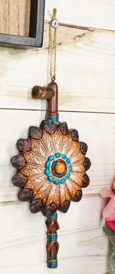 ? This Indian Warrior Calumet Wall Ornament is made of polyresin, hand painted and polished individually. Color Tone May Vary slightly from pictures.