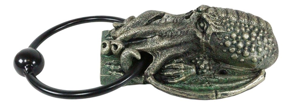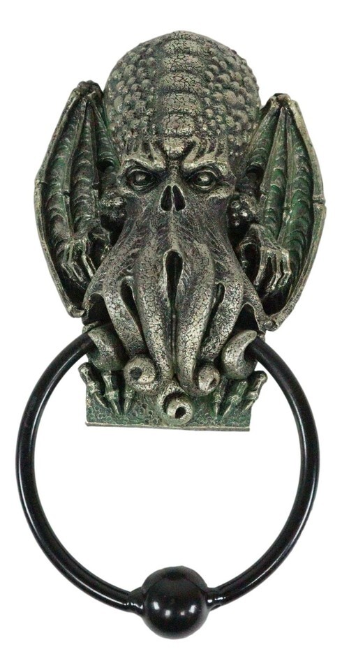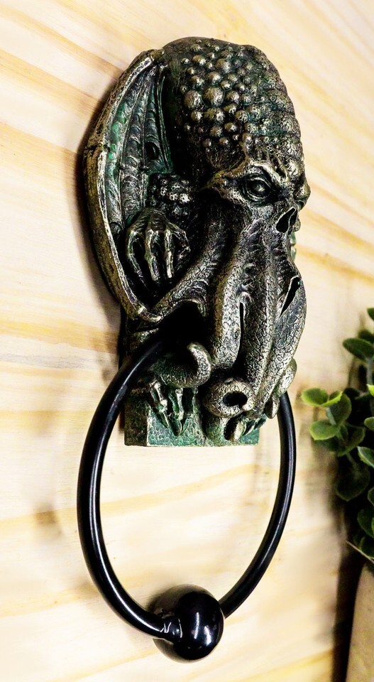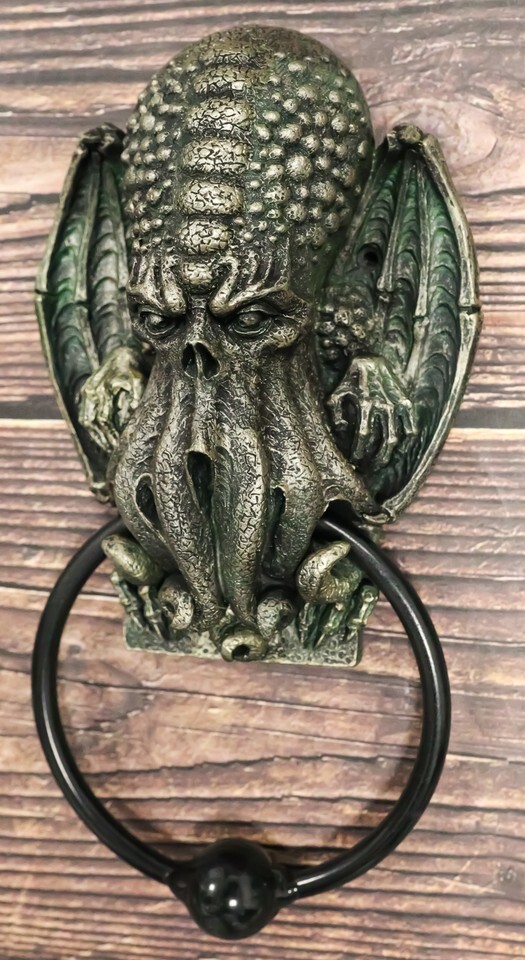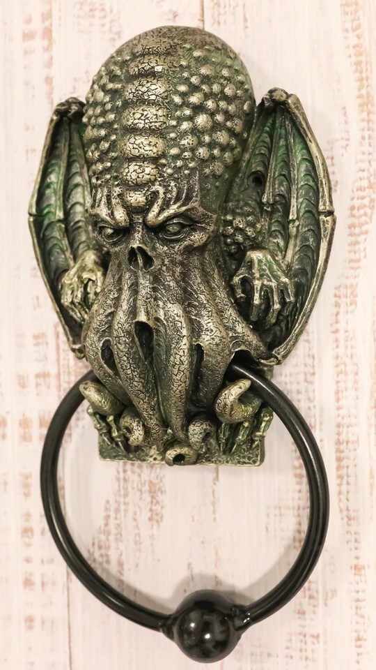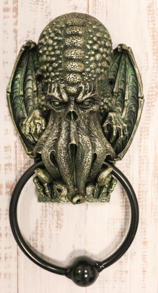 ? This Cthulhu Door Knocker is a bold statement for the front entrance to your home. This monster has a vague anthropoid outline, but with an octopus-like head whose face was a large number of tentacles, a scaly, rubbery-looking body, unusual claws and long narrow wings. Cthulhu resembles an octopus and a dragon with human caricatures. He's super tall, with webbed human-like arms and legs. This large creature first appeared in his short story "The Call of the Cthulhu" in 1928.