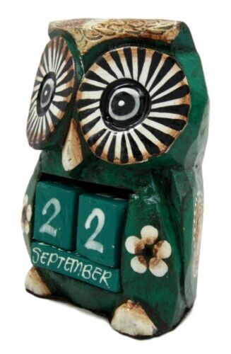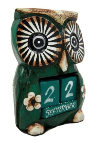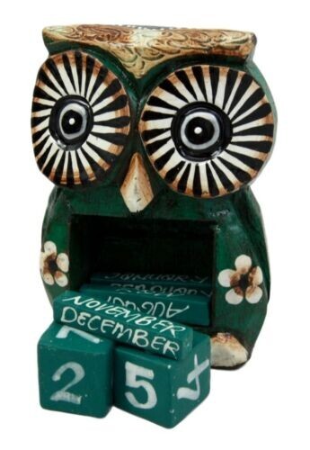 Balinese Wood Handicrafts Hypnosis Eyed Green Owl Desktop Calendar Figurine 4.5"